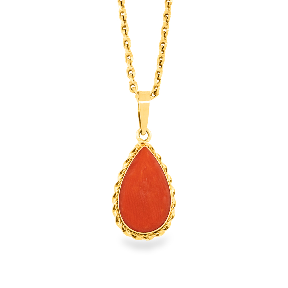 From our one-of-a-kind Estate Collection… An ornate 18k yellow gold pendant, set with a vibrant genuine carnelian gemstone in a twisted rope frame. It has been paired with a striking 18k yellow gold anchor link chain with a lobster clasp.