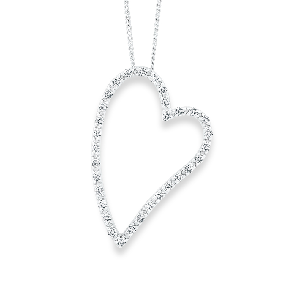 This asymmetrical floating heart pendant is crafted in 14k white gold and encrusted with shimmering round brilliant cut diamonds. Paired with a matching 14k white gold fine curb chain, closing with a spring ring.