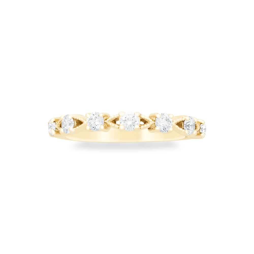A modern take on the classic eternity band, this 14k yellow gold ring features claw-set round brilliant cut diamonds accented with linear openwork details. In-Stock Ring Size 4