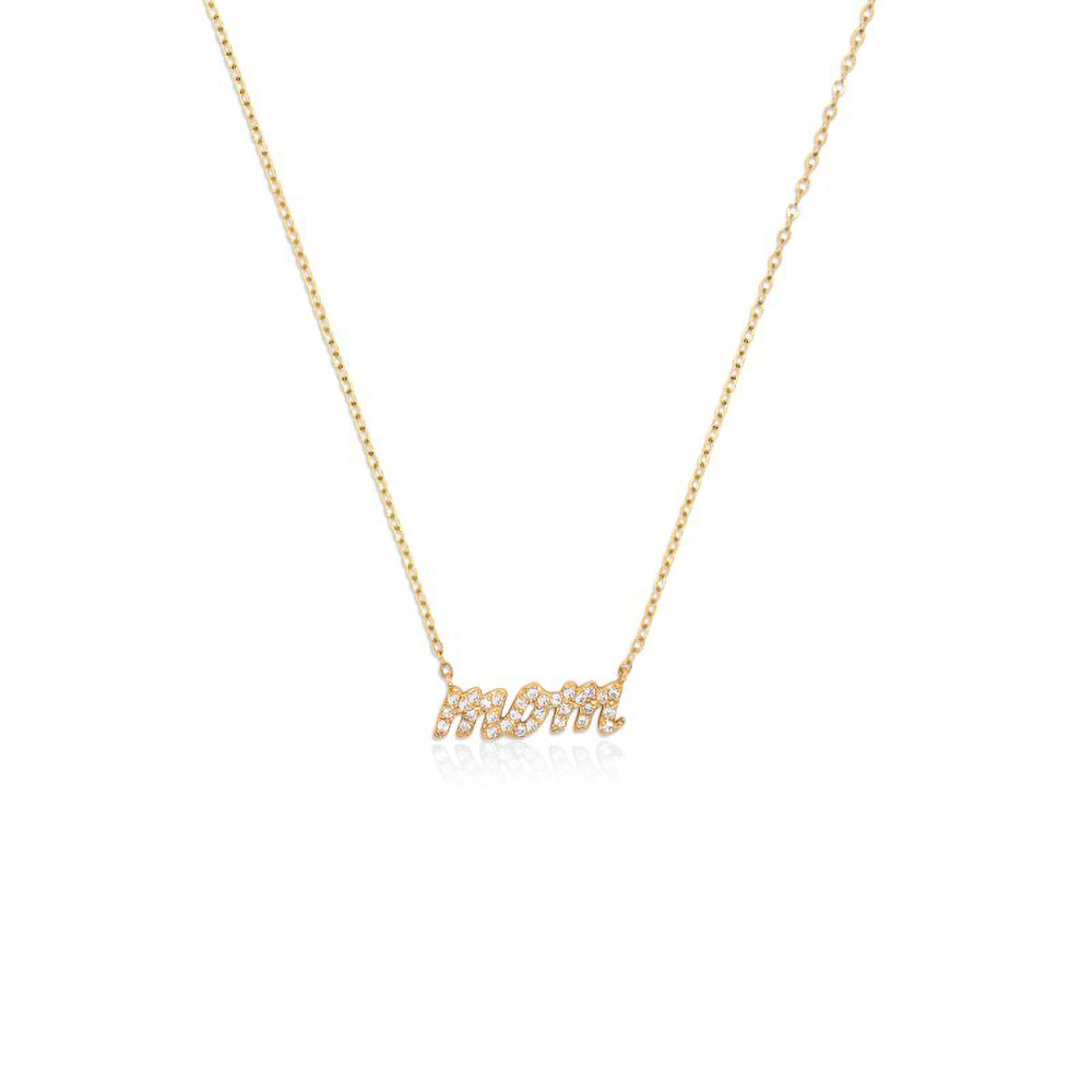 14k yellow gold “Mom” pendant with lab-grown diamonds, fixed at the centre of an adjustable rolo link chain.