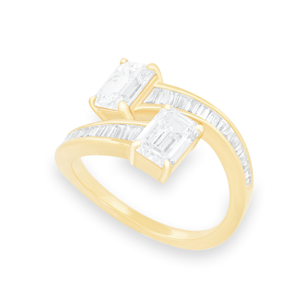 Bold 14k yellow gold bypass style ring, featuring lab-grown diamonds. The ring features two emerald cut lab-grown diamonds totalling 2.10ctw, accented with rows of channel-set baguettes. In-Stock Ring Size 7