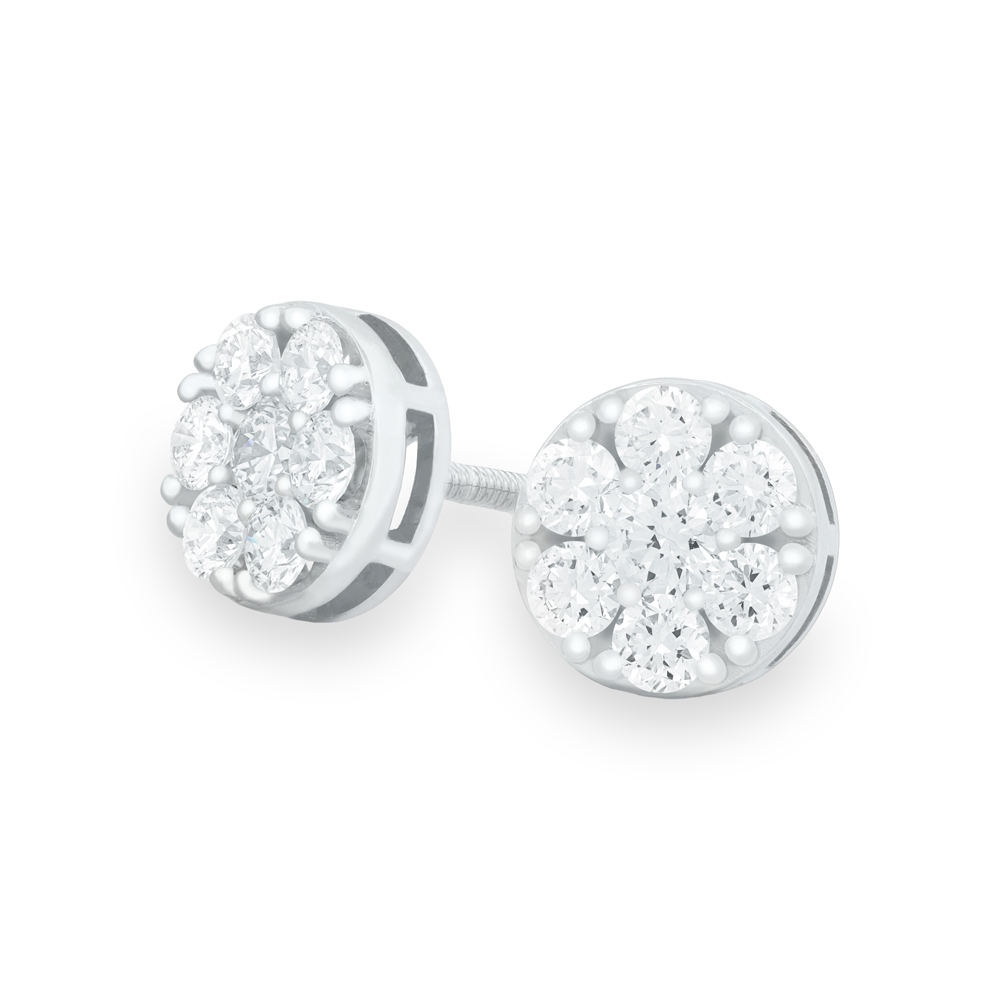 14k white gold stud earrings with a floral cluster of shimmering lab-grown brilliant cut diamonds. Straight posts and screw backings.