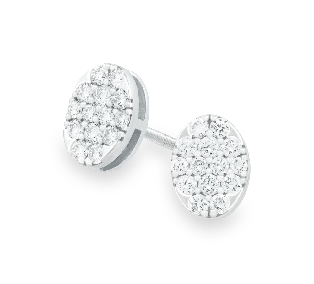 14k white gold stud earrings with an oval-shaped cluster of shimmering lab-grown brilliant cut diamonds. Straight posts and screw backings.