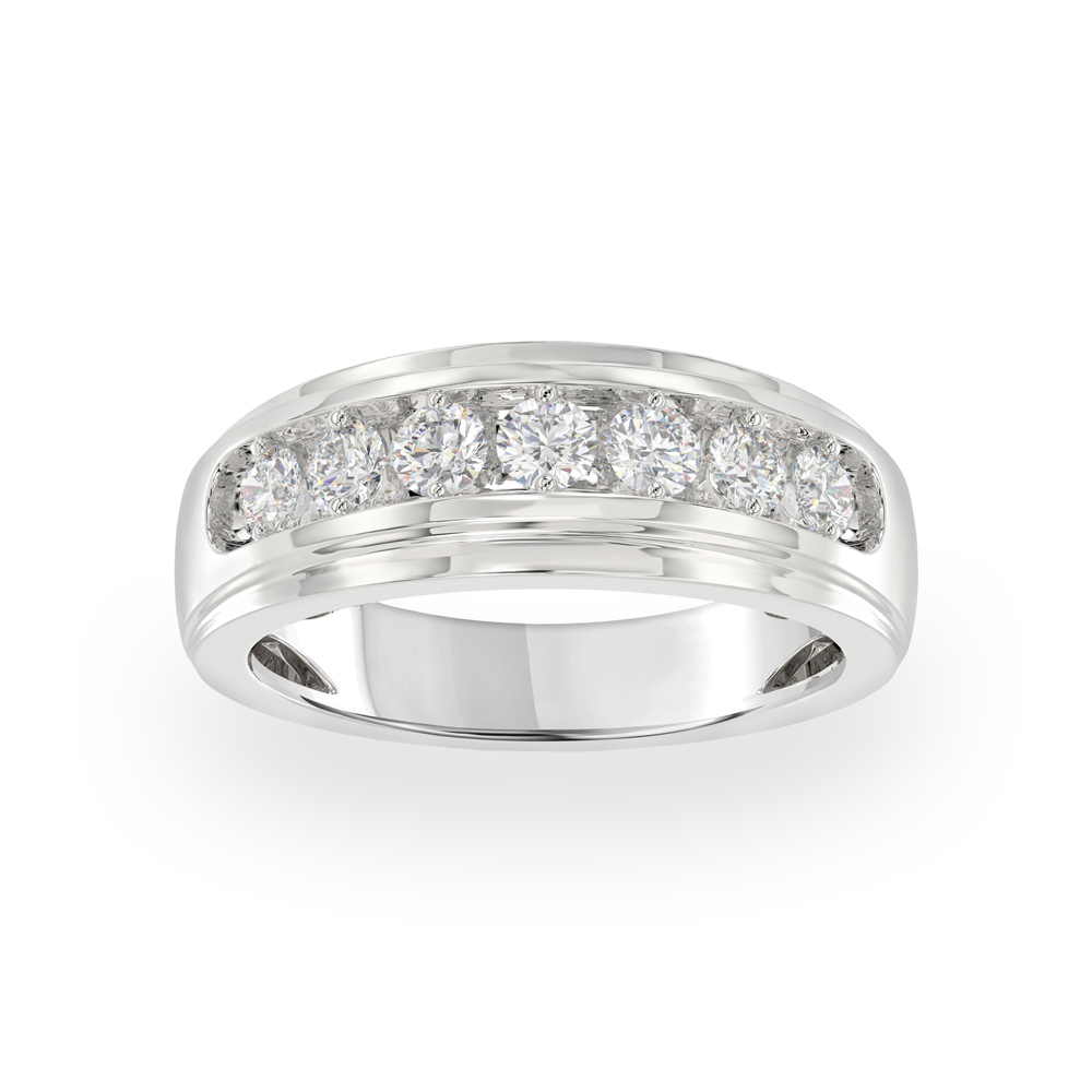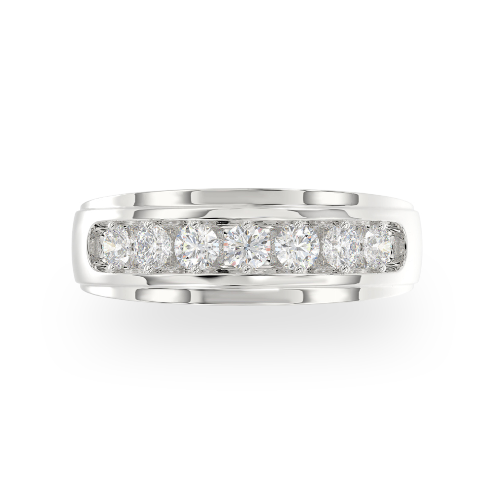 Crafted in sterling silver, this classic unisex band features seven (7) lab-grown brilliant cut diamonds in floating settings. Available in two carat total weights! In-Stock Ring Size 10