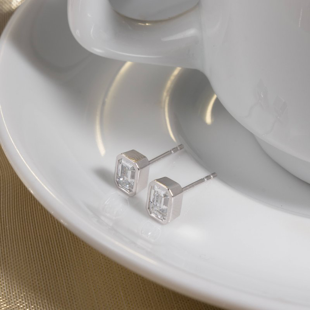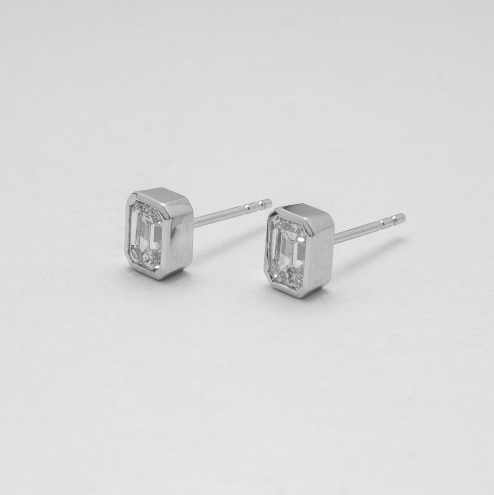 A modern take on the classic diamond stud, these sterling silver everyday earrings feature stunning emerald cut lab-grown diamonds in bezel settings. Straight posts with butterfly backs. Available by Special Order only.