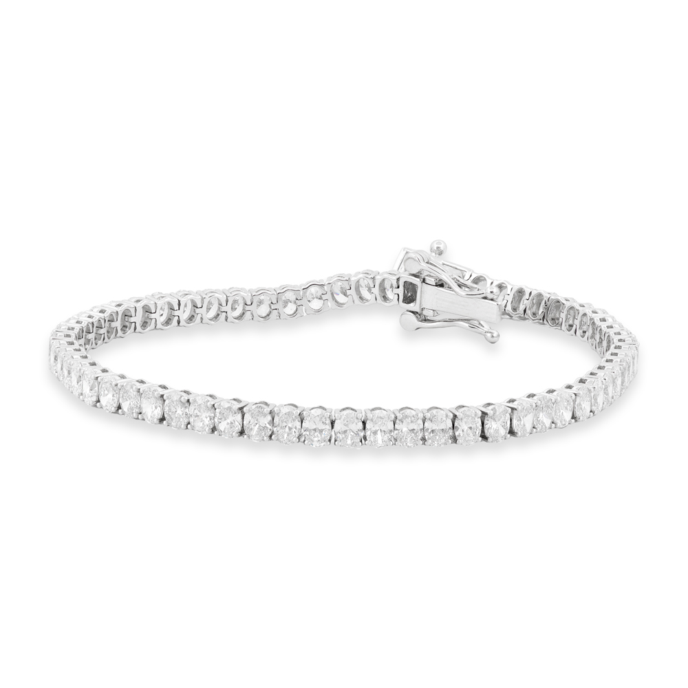 A modern take on the classic tennis bracelet! Crafted in 14k white gold and featuring 7.19ctw in stunning lab-grown oval cut diamonds. Closes with a box and tongue clasp, with double figure-8 safety catches for additional security.