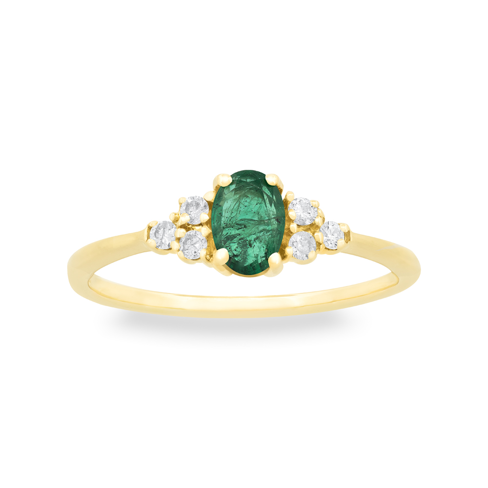 Understated and elegant, this 14k yellow gold ring features an oval-shaped vibrant green emerald complemented on each shoulder with a trio of brilliant cut diamonds. In-Stock Ring Size 8
