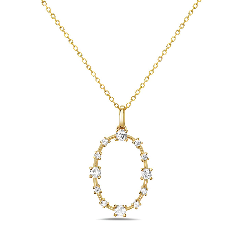 14k yellow gold open oval frame pendant, accented with an alternating bead and diamond pattern. It hangs from a matching 20” Italian 14k yellow gold rolo chain with a spring ring clasp.