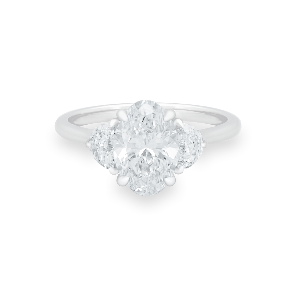 Crafted in 14k white gold, this unique trinity ring features over 2.5 carats in lab-grown diamonds. The centre features an oval-shaped lab-grown diamond, accented on either side with custom-cut half moon shaped diamonds. In-Stock Ring Size 7