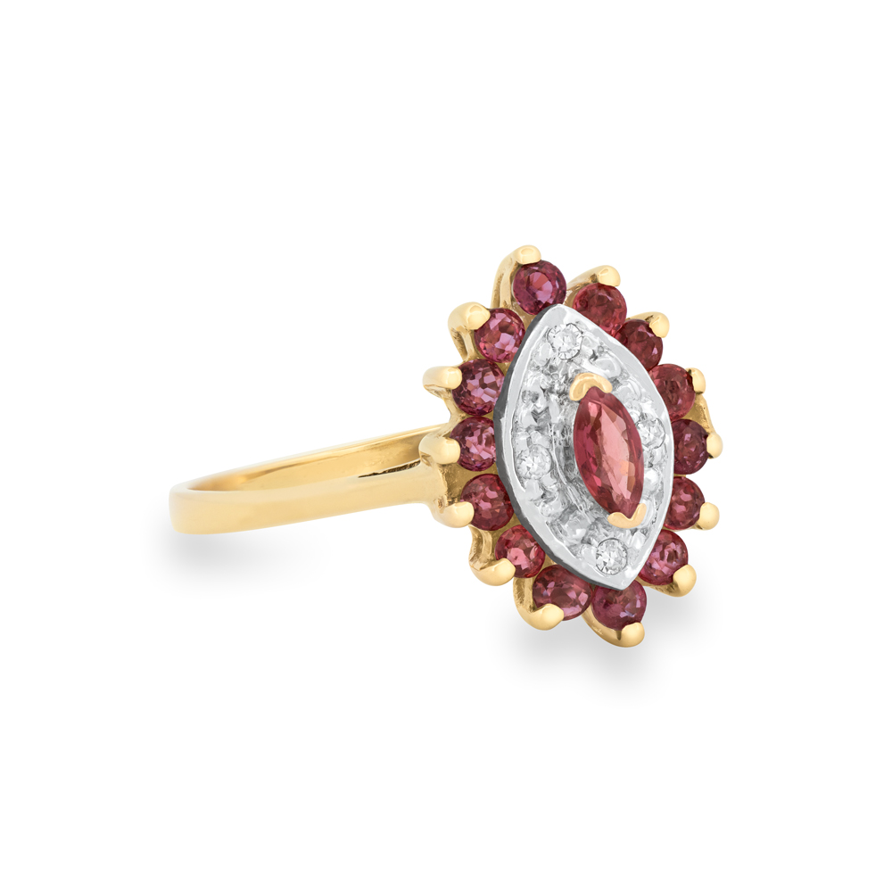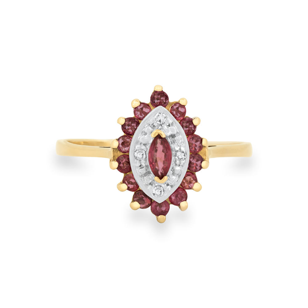 This vibrant birthstone ring is fashioned in 10k yellow gold, and features marquise and round cut rubies accented with a white gold halo of diamonds. In-Stock Ring Size 7.5