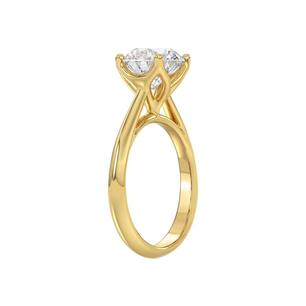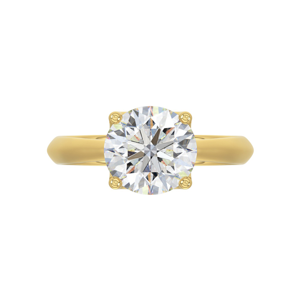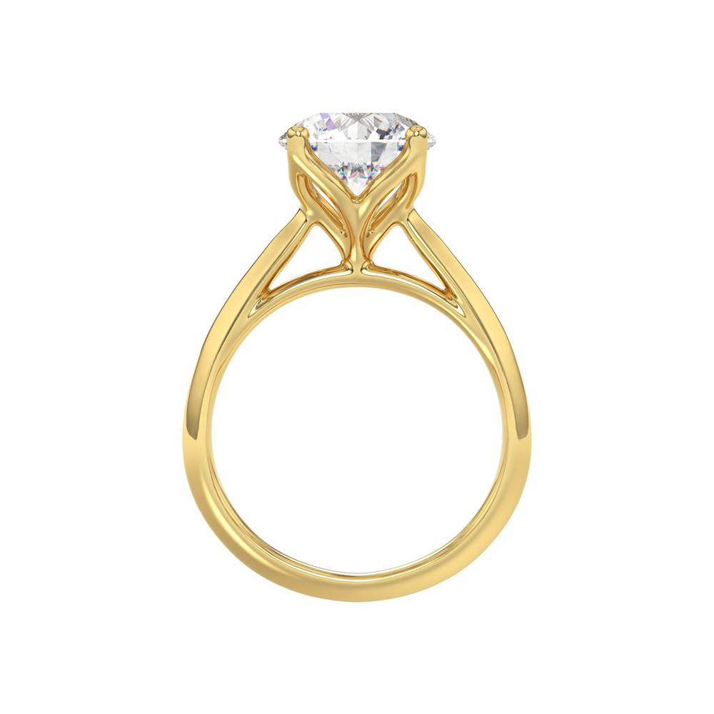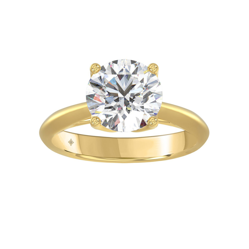 This classic 14k yellow gold solitaire showcases a lively 3ct round brilliant cut lab-grown diamond in a romantic tulip-style setting with knife edged shoulders. In-Stock Ring Size 7
