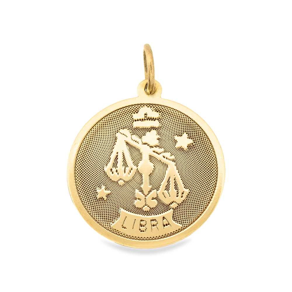 Fashioned in 10k yellow gold, this round medallion features an embossed depiction of the zodiac Libra on a textured background. It hangs from a simple round jump ring, soldered shut. Perfect on your favourite chain, or added to a chunky charm bracelet.